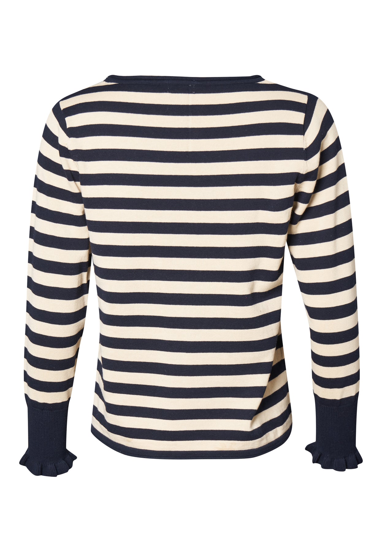 Denne strikkede pullover fra Lind har et klassisk og maritimt inspireret udtryk med sine smukke, brede striber. Den bløde bomuldskvalitet gør den behagelig at have på hele dagen, og de mørke kontrastkanter ved hals, manchetter og bund giver designet et moderne og velafbalanceret twist. Et afslappet men stilrent valg til hverdagen.